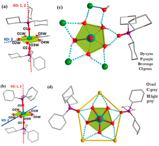 Crystal structures of (a) [Dy(Cy3PO)2(H2O)5]Cl3·(Cy3PO)·H2O·EtOH. (b) [Dy(Cy3PO)2 (H2O)5]Br3·2(Cy3PO)·2H2O·2EtOH (Cy3PO = tricyclohexylphosphine oxide). Coordination environment (c) Corresponding to (a). (d) Corresponding to (b). H atoms of the ligands are omitted for clarity. Red and blue dashed lines are the main anisotropy axes in the ground Kramers doublet and the excited Kramers doublet, respectively [80].