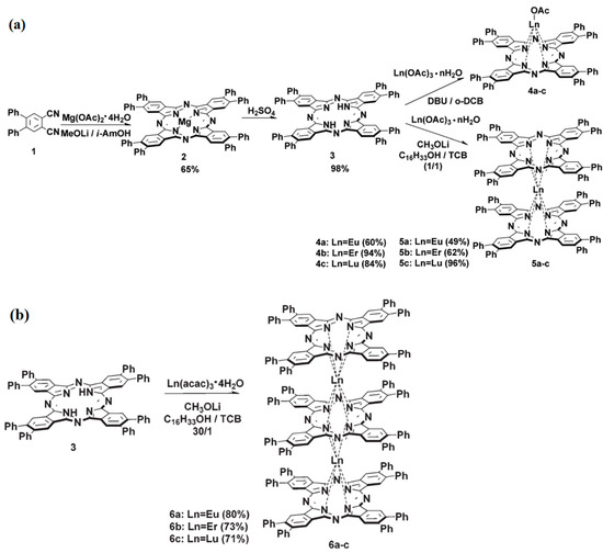 Dubinina et al. proposed a method for preparing Ln-Pcs in an alcohol/C12H8Cl4N2 (TCB) mixture. In this method, the Ln-Pcs were synthesized by a three-step procedure (Figure 15a). Then, phenyl-substituted Pc complexes 6a-c were synthesized selectively from ligand 3 and acetylacetonate salts of the corresponding lanthanides in a mixture of cetyl alcohol-TCB (Figure 15b). It can prepare Ln-Pcs of phenyl [83].