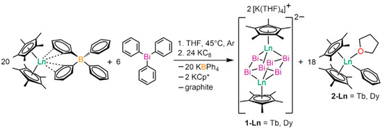 The schematic image: Synthetic scheme for [K(THF)4]2[Cp*2Ln2Bi6] (Ln = Tb, Dy) [90].