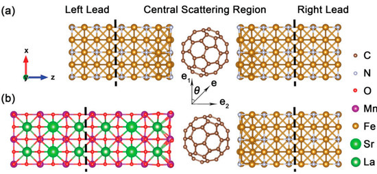 - Han, X.; Mi, W.; Wang, D. Tunneling magnetoresistance and light modulation in Fe4N(La2/3Sr1/3MnO3)/C60/Fe4N single-molecule magnetic tunnel junctions. J. Mater. Chem. C 2020, 8, 3137–3146. [Google Scholar] [CrossRef]