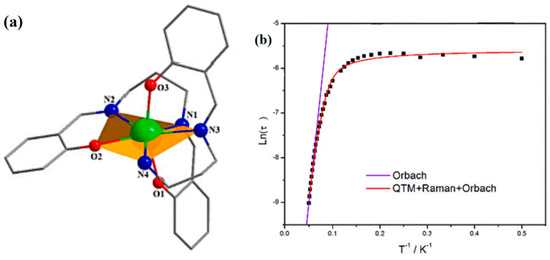 In 2021, Wang et al. synthesized the {Dy4(acac)4L4} compounds. Through studying the relationship between ln (τ) and T−1, and combining the Arrhenius law ln(τ) = ln(τ0) + (∆Eeff /kB)T−1, they obtained that Ueff reaches 34.1 cm−1 and the preexponential factor reaches 6.92 × 10−6 s [52].