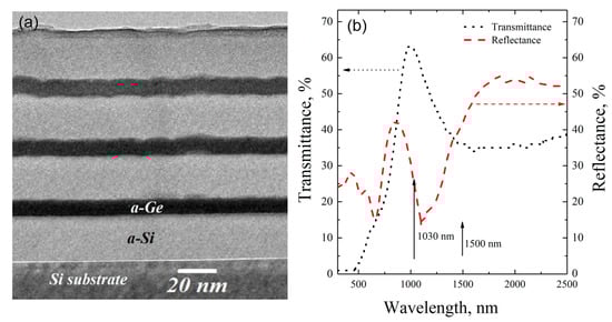 The cross-sectional TEM image (a) and transmission and reflectance spectra (b) of as-deposited Si/Ge MLS.