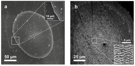 Examples of SEM images of spots produced on the MLS surface on a Si substrate by single and ten mid-IR laser shots in the ablative regime are shown in Figure 3. Under single-shot conditions, the central ablation region is fairly smooth and has a well-defined, sharp boundary (Figure 3a). However, nucleation of laser-induced periodic surface structures (LIPSS) is seen around the surface defects in the form of semi-concentric patterns (inset in Figure 3a) [28]. In the multi-shot regime (Figure 3b), the central ablation region is fine structured with LIPSS characteristic features [29].
