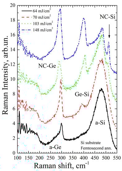 As the laser fluence increases, the fraction of the crystalline phase increases (70 mJ/cm2, red dashed line in Figure 5). However, at the same time, a peak arises from scattering on Ge–Si bond vibrations (~400 cm–1). This indicates that a Ge–Si solid alloy is formed at the Ge–Si interfaces but the layers of silicon that are not involved in mixing with germanium remain amorphous. In the case of the formation of Ge–Si solid alloys, it is impossible to determine the size of Ge or Ge–Si nanoinclusions. With further increasing laser fluence, almost complete intermixing between the Ge and Si layers occurs (174 mJ/cm2, blue dotted line in Figure 5). By comparing the relative intensities of the Ge–Ge and Ge–Si peaks, we can estimate the fractions of Ge and Si in the GexSi(1−x) NCs using the following formulas [34]: