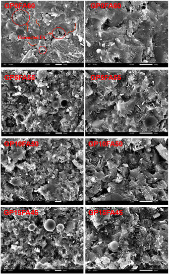 Figure 13 shows the microstructure of alkali-activated composite material at 28d under the synergistic activation of CCR and Na2CO3. It can be observed that the more incompletely reacted FA particles were inserted inside the matrix in the sample GP0FA60. Furthermore, many cracks and pores were observed in the sample GP0FA60, which were detrimental to the strength of the matrix. The SEM of sample GP20FA40 showed that no apparent cracks existed on the surface structure of the matrix, but some incompletely reacted FA was present. The incorporation of GP might consume the concentration of the alkali activation solution, resulting in an insufficient concentration of the alkali activation solution required for FA, which inhibited the destruction vitreous structure of FA and generated relatively more hydration products in the neighborhood of the GP particles [51]. In addition, the incompletely reacted FA was able to fill the pores of the matrix as an inert aggregate, which improved the mechanical properties to some extent [52].