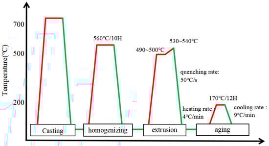 The chemical compositions of AA6005 and AA6061C alloys are shown in Table 1. The two alloys have the same content of Mg + Si (1.35 wt%) to obtain the close value of yield (260–270 MPa). The entire thermal cycle that specimens experienced during processing is exhibited in Figure 1. The industrial-scale billet with 127 mm diameter were DC-cast. In preparation for the following hot extrusion, the cast billets were homogenized at 560 °C for a holding time of 12 h, and afterwards they were preheated to 500 °C [27]. Plates with a 2 mm thickness and 110 mm width were produced at a solutionizing temperature of 530 °C using a 1000-ton direct press. The plates were then quenched through the water bath to keep the alloying element in solid solution. Finally, the plates were aged at 170 °C for 12 h to achieve the T6 temper.