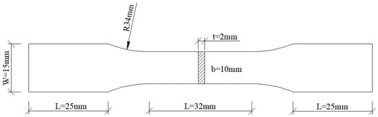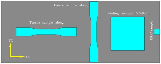The tensile hardening behavior was characterized by performing a quasi-static uni-axial tensile test. Standard tensile specimens machined from the extruded plates in Figure 2 along extruding direction (ED) and transverse direction (TD) are shown in Figure 3. The test was conducted at ambient temperature with a strain rate of 6.7 × 10−4 s−1 and performed three times to ensure repeatability.