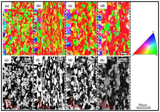 IPF and gray maps showing the through thickness microstructure: (a,e,b,f) AA6005; (c,d,g,h) AA6061C; (a,e,c,g) TD-ND Plane; (b,f,d,h) ED-ND plane.