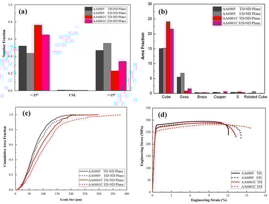 The typical tensile stress–strain curves are shown in Figure 6d. AA6061C has a comparatively low yield and high elongation. The 0.2% yield stress (or UTS) in the ED is 270 MPa (295 MPa) for AA6005 and 260 MPa (289 MPa) for AA6061C. The yield stress of both alloys (or UTS) is about 3% lower in the TD as compared to that in the ED (see Table 2). It is consistent with the values of the Schmid factor (i.e., 0.43 in the ED and 0.45 in the TD), which was computed from the EBSD data and was influenced by the texture components [29].