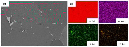 Backscattered electron diffraction (BSD) pattern (a) and elements mapping (b) of as-cast alloy AA6005.