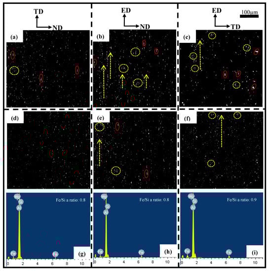 Backscattered SEM image and EDS for β-AlFeSi constituent particles: (a–c) AA6005 alloy; (d–i) AA6061C alloy; (a,d,g) TD-ND plane, (b,e,h) ED-ND plane, (c,f,i) ED-TD plane.