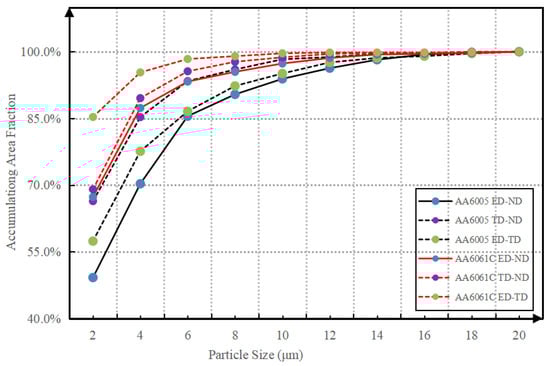 The AlFeSi phase is formed in the interdendritic region during the final stage of solidification at the industrial cooling rate in AA6005 and AA6061 alloys [30,31]. Figure 7 shows the typical morphology of the AlFeSi phase and EDS elemental mapping. The AlFeSi phase in the as-cast state is identified by needle-like shapes or fragments of skeletons along the grain boundary. Figure 8 displays the distribution of the intermetallic particles on the TD-ND, ED-ND and ED-TD planes after extrusion. It is obvious that the hot extrusion changed the morphology and spatial arrangement of the AlFeSi phase, and its atom ratio of Fe/Si (0.8~0.9) is close to that of the β-Al5FeSi phase (see the EDS results in Figure 8). The brittle particles were broken to develop the mall clusters to within dozens of micrometers (as pointed by yellow circles) and string-type clusters to within hundreds of micrometers (as pointed by yellow arrows) along the ED on ED-ND and ED-TD planes, whereas the particles are randomly arranged on the TD-ND plane. The excessive Mg contributed to particles’ fragment during hot extrusion and resulted in the comparatively uniform distribution of particles in AA6061C (see Figure 8). In contrast, AA6005 with high Si content tended to develop dense particle clusters along the ED. Table 3 summarized the size, area fraction and number density of the particles in AA6005 and AA6061C. The two alloys both have comparatively high values of area fraction and average size of particles on the ED-ND plane. Figure 9 further shows the evolution of the particles’ accumulation of area fraction with size. The area fraction of particles smaller than 6 µm is 92% in AA6061C, 7% higher than that in AA6005. It is also apparent that the ED-ND plane shows more large particles in contrast to the TD-ND plane.