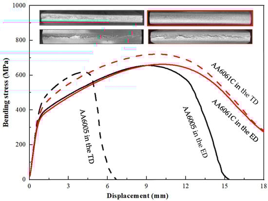 The stress–displacement curves obtained from the AA6005 and AA6061C alloys during bend in the ED and TD; the reproducibility of the results is good.