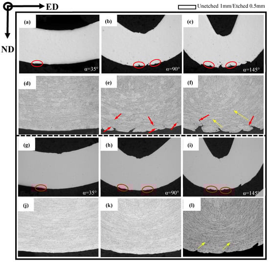 Through thickness optical micrographs of as-bent samples in the ED (unetched and etched): (a–f) AA6005 alloy; (g–l) AA6061C alloy; (a,d,g,j) 35°; (b,e,h,k) 90°; (c,f,i,l) 145°.