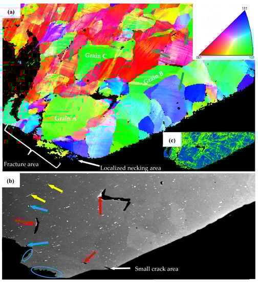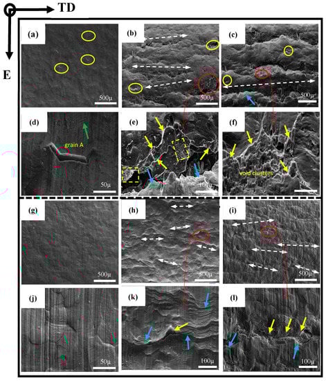 The previous results in Figure 11e,f indicate that heterogeneous nucleation grain boundary particles assist the cracking process in AA6005. Some signs of voids opened out and broken particles are noticeable along the crack path (see red circles in Figure 16c), which further indicates that the particles promoted the surface crack in AA6005. The cracks initiated within the valleys further propagated a localized necking area, which facilitated the development of shear bands along an approx. 45° shear direction (see yellow arrows in Figure 11e). The occurrence of crack propagation is impossible because void coarsening is limited during bending in the ED.