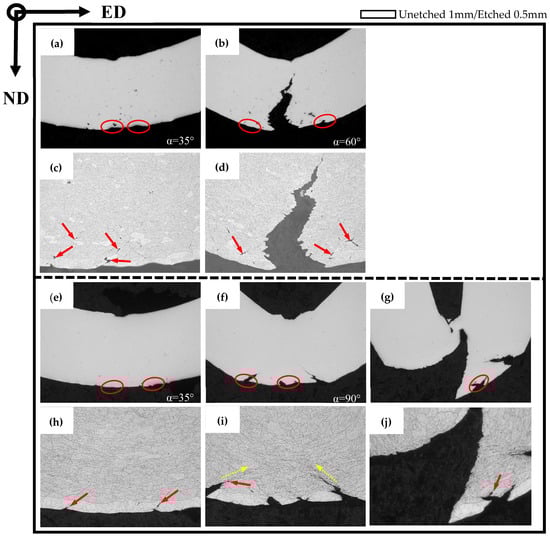 Through thickness optical micrographs of as-bent samples in the TD (unetched and etched): (a–d) AA6005 alloy; (e–j) AA6061C alloy; (a,c,e,h) 35°, (b,d,f,i) 90°; (g,j) 145°.