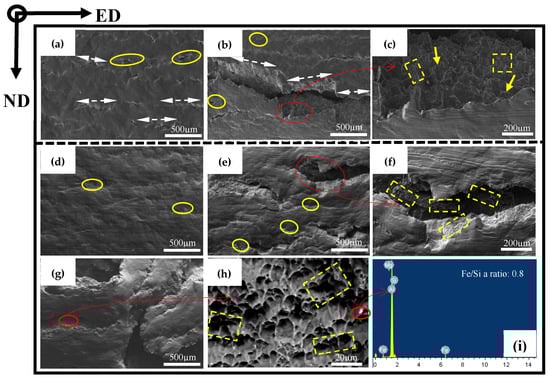 Excessive Mg is able to blunt the surface crack and cause a delay in fracture for AA6061C during bend in the TD. The AA6061C specimen after a 35° bend showed few grain boundary reliefs on the outer tensile surface (see Figure 13e and Figure 14d). Meanwhile, no signs of decohesions along the grain boundary are noticeable. Several macro surface grooves (i.e., valleys) are present along the elongated surface and are encircled in red in Figure 13f after a 90° bend. The cracks appear to initiate within these grooves and extend a few hundred micrometers through the thickness (see Figure 13i) and several millimeters roughly along the bend axis. It is important to note that the development of shear bands (see yellow arrows in Figure 13i) assisted the intense strain localization and grain boundary decohesion along the region ahead of the crack tip. At an even larger bend angle of 145° (see Figure 13g,j), the macro-crack had almost propagated through the entire thickness. As compared to the zig-zag pattern observed in AA6005, the crack path appears to be a more planar-flat type. Fine dimples (as pointed by the yellow rectangles) and comparatively ambiguous polycrystalline structures are observed on the fracture surface of AA6061C shown in Figure 14f,h. The EDS result (see Figure 14i) further indicates that β-AlFeSi particles also assist the crack propagation in AA6061C. It is apparent that the fracture model in AA6061C is the predominantly transgranular fracture but the predominantly intergranular fracture in AA6005.
