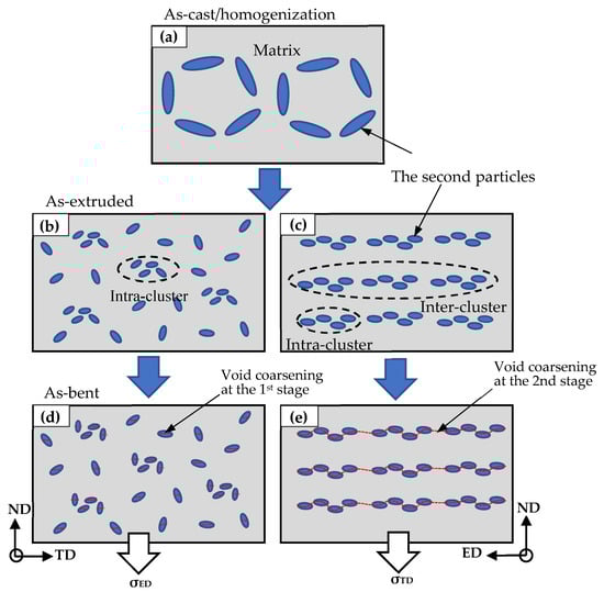 Schematic of the effect of anisotropic particle clusters in as-extruded materials on the bend damage behavior: (a) as-cast; (b) along the TD-ND plane; (c) ED-ND plane after extrusion; (d) along the TD-ND plane; (e) TD-ND plane after bend.