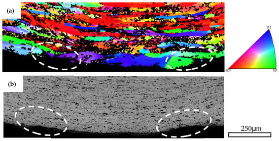 Figure 16 shows the IPF map near the outer tensile surface of AA6005 after a 145° bend in the ED and the corresponding OM and SEM images of the local area encircled in Figure 16a. Figure 17 shows the IPF and corresponding OM maps of AA6061 after a 145° bend. It is apparent that several through-thickness layers of grains show intense strain localization (see white circles in Figure 16a and Figure 17a). However, the region corresponding to the surface peaks is comparatively free of intense strain. Muhammad and co-workers [8] investigated the surface roughing behavior of an extruded AA6063 alloy during bend and revealed a similar phenomenon. It can be concluded that the through-thickness strain localization in the vicinity of the outer tensile region acts as a precursor to the formation of surface undulations (i.e., hills and valleys). The microstructure of AA6061C (i.e., low Goss component, random distribution of particles) promotes the strain uniform distribution along the outer tensile surface and causes a delay in surface roughing. A set of shear bands emanating from the surface’s low cusp regions are observed in AA6061C and can be seen to have propagated inside at a length of a couple of hundred micrometers (see yellow arrows in Figure 11i). It is suggested that surface undulation acts as a precursor to shear banding and is also promoted by the shear band as further increasing the bend angle. It is to be noted that the surface crack in AA6005 is also closely related to the shear band developing and surface roughing, which is discussed next.