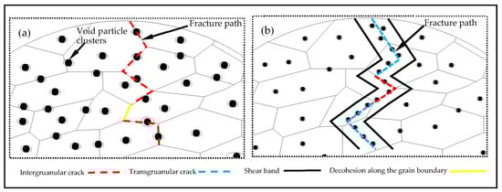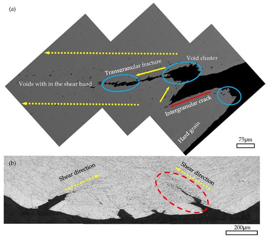 The model of GBDF is limited in AA6061C due to the small size and random distribution of the particles (see Figure 8 and Figure 9). Figure 19 shows the crack propagation inside the AA6061C specimen after bending to 90° in the TD. Based on the results shown in Figure 13 and Figure 14, the fracture of AA6061C in the TD is preceded by particle cracking, voiding and the development of a shear band. The cracking behavior of AA6061C in the TD is similar to that of AA6005 in the ED, i.e., cracks within the valleys, grain boundary decohesion and void clusters opened out along the crack path (see blue circles in Figure 19a). When the bending axis is parallel to the ED, broken particles and void nucleation are easier to occur within the shear band (see Figure 19a). The void’s coarsening and clustering shortens the space between neighbors as the shear band propagates ahead and stimulates the transgranular fracture. In contrast, the crack propagation is limited during the bending of AA6005 in the ED because the void’s coarsening and clustering are blunted when the loading is applied perpendicular to the inter-clusters (see Figure 15d).