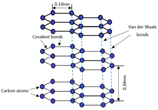 Graphite is the crystalline form of carbon, which is formed by the arrangement of carbon atoms in a hexagonal structure. The structure of graphite is illustrated in Figure 1. In graphite, the carbon atom arranged in the honeycomb lattice has an average covalent bond length of 0.14 nm [10]. Graphite is the most stable form of carbon, which naturally exists under standard conditions [6]. Moreover, graphite is also made up of numerous graphene layers. The interplanar spacing, d, of the (002) graphite is approximately 0.34 nm [11]. When single-atom graphene layers are stacked and held together by Van der Waals weak forces, graphite is formed [12]. Due to the weak Van der Waals forces located in between the graphene layers, graphite develops a soft and slippery property as the Van der Waals force can be easily substituted by an external force.