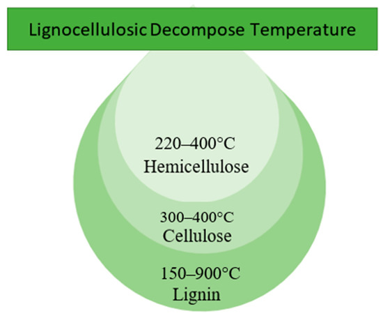 Lignocellulosic biomass (LB), which contains cellulose, hemicellulose, lignin and negligible amounts of pectin and ash, has high organic carbon content [96]. In general, most of the hard-shell biomass is LB due to its cellulose content. It is a linear polymer consisting mainly of 3000 to 14,000 glucose monomers linked together by 1,4 glycosidic bonds. This cellulose polymer is normally found in the woody parts of plants and provides the plant with the properties of being hard and insoluble in water [97]. The lignocellulosic decomposition temperature according to thermogravimetric analysis (TGA) is depicted in Figure 2. According to TGA studies, hemicellulose decomposes at a lower temperature (220–315 °C) than cellulose (300–400 °C), whereas lignin decomposes at a higher temperature (150–900 °C) [98,99,100]. Thus, the decomposition of LB is strongly influenced by its composition, as cellulose, hemicellulose and lignin in LB decompose at different temperature ranges.