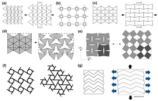Auxetic structures: (a) re-entrant triangular structure, (b) re-entrant star structure, (c) re-entrant hexagonal structure, (d) rotating triangle, (e) rotating square, and (f) chiral structure [10]. Copyright 2010, Academic Journals. (g) foldable structure [11]. Copyright 2019, SAGE Publications Ltd.