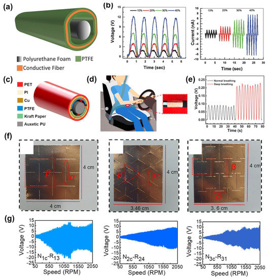 A triboelectric nanogenerator (TENG) is a new type of green energy device that converts mechanical energy into electrical energy through triboelectrification and electrostatic induction [89]. Its mechanism as a sensor is to reflect the magnitude and form of the force through the strength and waveform of the electrical signal (voltage or current) generated. The wide range of materials and facile fabrication process makes it easy to be flexible [90,91], stretchable [92,93], breathable [94,95], and washable [96]. Moreover, some textile-based TENGs can be seamlessly integrated into clothing [97,98], showing great potential in wearable sensors. However, the sensitivity of conventional materials is often limited, and auxetic materials or structures exhibit considerable advantages in enhancing the sensitivity of TENGs. In 2017, Zhang et al., pioneered the application of auxetic materials to a contact TENG strain sensor. As shown in Figure 7a, the auxetic sensor consisted of a core-auxetic PU foam and a shell-polytetrafluoroethylene (PTFE)-conductive fabric-PTFE layer. When the tension was applied to the auxetic foam, the foam expanded and contacted the PTFE layer to triboelectrically electrify. Its open-circuit voltage and short-circuit current sensitivities to strain are shown in Figure 7b, implying a higher strain sensitivity than other TENGs [99]. In addition, the auxetic foam had high resistance to indentation and shear, which could provide better durability for the sensor. Feng et al., applied an auxetic foam-based TENG (Figure 7c) to the belly of the seat belt to monitor the driver’s breathing state (Figure 7d,e). The sensor showed a high sensitivity of 0.89 V/cm2 in a strain range of 40–100%, which could be used to provide an alarm in the event of danger [100]. For use in wearable products, textile-based TENG sensors have great advantages. The auxetic yarn made of TPU as the core yarn and conductive polyamide as the wrap yarn prepared by high-speed ring spinning method was inserted into a woven fabric as weft yarn to form a TENG. The TENG sensor had distinctly varying electrical outputs under different stretching strains and can be used as stretch sensors for smart sports products, such as being embedded into a self-counting yoga elastic band [101]. Due to the feasibility of mass production, this triboelectric auxetic sensing yarn offered a promising direction for self-powered sensors. In 2022, Ye et al., prepared auxetic TENGs with three different structures (rotating quadrilateral structure, rotating triangular structure, and “I”-shaped structure) (Figure 7f) to study the influence of structural parameters on sensor performance. As shown in Figure 7g, the sensor N1c-R13 with a rotating quadrilateral structure and a ratio of cutting marks to cell structure size (α/β) of 1.4/2.0 showed the largest voltage output [102].