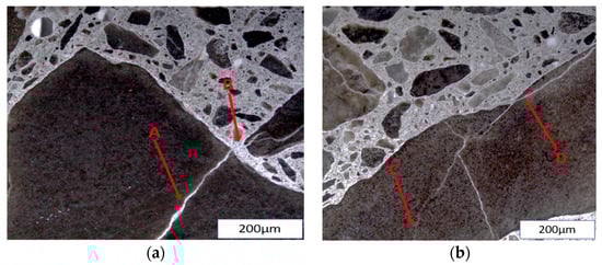 The ASR is initiated in the concrete microstructure and produces internal cracks long before the manifestation of surface cracks or other symptoms. The internal cracks in ASR-affected concrete can be correlated to its induced expansion [27], thus emphasizing the need to assess the influence of various exposure conditions on the microstructural behaviour of the reaction. Cracks due to ASR, as shown in Figure 1, were observed as being initiated within the aggregate particles (i.e., fine or coarse) and propagating to the cement paste. Coarse aggregates have been known to have a different effect on induced expansion when compared to fine aggregates [28]; cracks generated by the latter propagate faster into the cement paste due to their small size [29]. Thus, the physical integrity determined by the inner damage (pattern and extent of cracks) of affected concrete at different moisture and temperature conditions, bearing distinct aggregates with different reactivity levels, can vary.