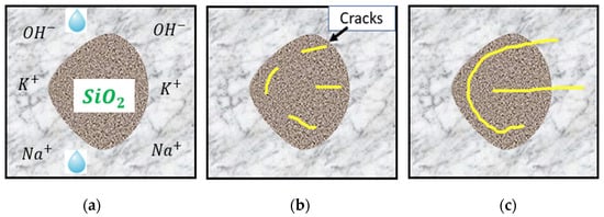 Sequence of ASR: (a) factors needed for ASR; (b) initiation of cracks; (c) propagation of cracks. Modified from [31,32].