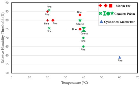 According to the studies [25,75] carried out on concrete prisms stored at 40 °C, as shown in Figure 3, specimens containing reactive coarse content have an RH threshold of 75% compared to the 65–70% RH needed for the mix prepared using a reactive fine aggregate. Hence, a lower moisture level could be sufficient to initiate the reaction in specimens involving reactive fine aggregate. After all, ASR-induced cracks propagate faster in reactive fine aggregates due to their small size. Lastly, the RH threshold required for the reaction could vary depending on the sample size and shape. After all, the rate of the reaction and ultimate ASR-induced expansion differ in concrete prisms, cubes, and cylinders incorporating reactive aggregates [77]. Thus, the varying sample types used in the available studies may play a role in the varying thresholds reported in the literature.