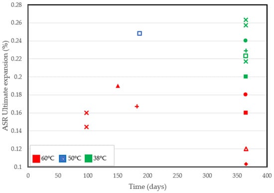ASR-induced ultimate expansion at different temperatures reported by several authors [71,77,82,88,90,91,92,93].