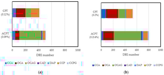 Damage features counted in CPT (38 °C, >95% RH) and ACPT (50 °C, >95% RH) at 0.1% and 0.20% expansion levels: (a) comparison of DRI results at 0.1% expansion; (b) comparison of DRI results at 0.2% expansion. Adapted from [16,66].