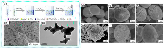 (a) Schematic diagram of the synthesis process of W-Re precursor powders. (b) Microstructure of W-10Re precursor powder reduced at 1000 °C, and (c) the powder corresponds to TEM images [34]. Microstructure of W-75Re precursor powders prepared by the spray-drying process with solution concentrations of (d) 20 g/L, (e) 40 g/L and (f) 60 g/L, and the microstructure of powders with solution concentrations of 20 g/L reduced at (g) 350 °C for 2 h followed by 950 °C for 2 h, (h) 450 °C for 2 h followed by 950 °C for 2 h and (i) 550 °C for 2 h followed by 950 °C for 2 h [35].