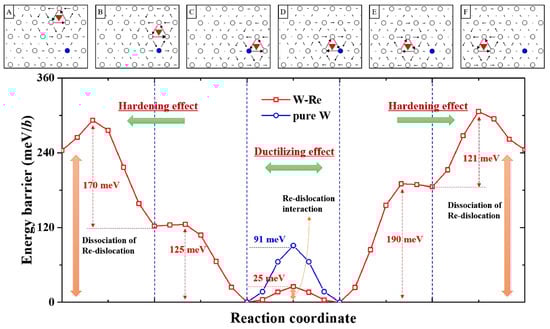 The plastic deformation of BCC metals is related to non-planar screw dislocations, which induce high lattice friction during diffusion [40]. It is worth noting that there are many types of dislocation cores in BCC structures [65,66]. The symmetry of the dislocation core affects the slip plane and consequently affects the macroscopic plastic deformation behavior of alloys. Romaner et al. found that, after alloying with Re, the symmetric screw dislocation core in tungsten transformed into an asymmetric one. In addition, the slip system of the dislocation changed from {110} to {112} [52]. The latter had six more slip planes than the former. Consequently, the Peierls stress of W-25 at.% Re alloy decreased from 2.49 GPa for pure tungsten to 1.84 GPa [40,52,67]. Li et al. studied the influence of Re on the Peierls energy in tungsten [68]. Figure 2 shows the energy barrier of the migration of the screw dislocation with and without Re atoms. When the screw dislocation approaches Re atom (as shown in Figure 2 from A to B, from B to C, from F to E and from E to D), the energy barriers are 49 meV/b, 3 meV/b, 61 meV/b and 5 meV/b, respectively, much lower than the 91 meV/b found in pure W. However, when the screw dislocation moves away from Re (as shown in Figure 2 from C to B to A and from D to E to F), the energy barriers increase to 121–190 meV/b. Interestingly, the energy barrier is a low as 25 meV/b when the screw dislocation migrates from C to D, indicating that Re effectively reduces the shear resistance of screw dislocation migration in tungsten. It promotes the movement of screw dislocation during plastic deformation. These results are consistent with the findings of Medvedeva and Qian, who found that the presence of Re reduced the generalized stacking fault energy (GSFE) and shear resistance of <111>{110} in W, leading to an increase in the migration rate of 1/2<111> screw dislocations [62,69,70].