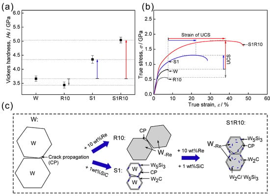 (a) Vickers hardness, (b) stress–strain curves and (c) schematic diagrams of compressive fracture mechanisms of W, W-10Re, W-1SiC and W-10Re-1SiC [22]. The symbol “UCS” in (b) represents “Ultimate Compressive Strength”. The symbol “W”, “R10”, “S1”,“S1R10” in (a–c) represents “W”, “W-10Re”, “W-1SiC”, “W-10Re-1SiC”, respectively.