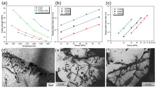 Creep is an inevitable process of plastic deformation that occurs during operation at high temperatures [103]. It is defined as the time-dependent plastic deformation of materials under high-temperature and low-stress conditions. The creep behavior of materials should be considered during the material design, otherwise the lifetime of the materials will fall short of expectations [103]. The creep strength is an important parameter for estimating the long-term creep performance of materials [104]. Figure 4a illustrates the effects of a second phase on the creep strength of tungsten and tungsten alloys, as reported in the literature [25,104,105]. It can be seen that pure W has the lowest creep strength at different temperatures, and the addition of a small amount of Re slightly improves the creep strength of W-Re alloys. The addition of Re can increase the creep activation energy by 28 kJ/mol [106] and provide solid solution strengthening, resulting in the higher creep strength of W-Re alloys than pure W. Moreover, the creep strength of W-Re alloys is significantly improved after adding ZrC. However, the creep strength of the W, W-Re and W-Re-ZrC systems converges to a saturation value as the temperature increases, indicating that the strengthening effect of ZrC on W-Re alloys decreases with increasing temperature [25]. The decrease in the strengthening effect is attributed to the evolution of dislocation under elevated temperatures, as shown in Figure 4e,f. Dislocation entanglement and dislocation pinning are observed in ZrC-doped W-Re alloys at 1900 K. However, the dislocation entanglement disappears and a dislocation network/wall is present at 2200 K. Compared with ZrC-doped W-Re alloys, HfC-doped W-Re alloys exhibit a higher creep strength, which is attributed to the obstruction of the dislocations by the subgrain structure (shown in Figure 4d) [104]. The relationships between the steady-state creep rate and temperature of W-Re-ZrC and W-Re-HfC alloys are indicated at Figure 4b,c, respectively [25,104]. It can be seen that the relationship between the stress and steady-state creep rate is linear in the two samples. The small changes in the slope of the lines indicate that the stress exponents of W-Re alloys with ZrC and HfC additions are insensitive to temperature [104].
