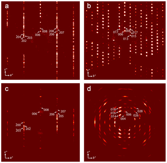 Reconstructed sections of reciprocal space obtained for (h0l) and (0kl) sections for kukisvumite (a,b) and K3 form (c,d).