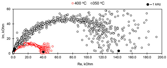 The hodographs of impedance (Figure 4) were prepared in the frequency range from 1 Hz to 1 MHz using impedance meter Z2000 in order to determine sample conductivity at alternating current in each measurement point. The frequency of 1 kHz at which measurements corresponded to the total resistance of the sample, without contribution of electrode processes was determined based on the graph. Additionally, the resistance of the samples was determined with a short-term (up to 5 s) application of direct current, which allows evaluation of the possible contribution of electrode processes using the difference between the two measurements.
