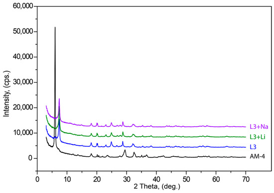 Powder X-ray diffraction patterns of initial AM-4, L3, L3 + Li and L3 + Na phases.