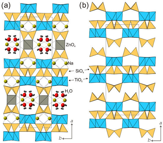 The kukisvumite crystal structure [59] is based upon a three-dimensional framework consisting of titanosilicate layered blocks linked by ZnO4 tetrahedra (Figure 9a). The titanosilicate blocks are 1.2 nm thick and consist of chains of edge-sharing TiO6 octahedra and pyroxene-like [Si2O6] chains of corner-sharing SiO4 tetrahedra. The chains of the two types are linked together by sharing common O atoms. Zn2+ cations are located between the titanosilicate blocks and provide their linkage into a three-dimensional octahedral–tetrahedral framework that contains one-dimensional channels with a crystallographic free diameter of 4.0 × 4.8 Å2. The channels are parallel to [001] and are occupied by Na+ cations and H2O molecules. In addition to the intra-channel Na sites, the structure of kukisvumite contains additional Na sites in the interior of titanosilicate blocks. All Na sites are octahedrally coordinated by O atoms.