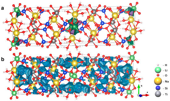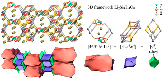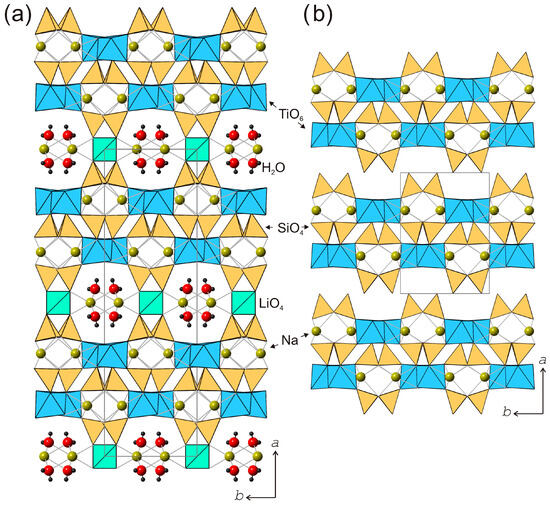 The crystal structure of lintisite [60] (Figure 10a) is closely related to that of kukisvumite and contains the same type of titanosilicate blocks. However, their linkage into a three-dimensional framework is achieved via the insertion of Li+ cations into the interlayer, which adopts a tetrahedral coordination. The LiO4 tetrahedra link titanosilicate blocks along [100] to create structural channels occupied by Na+ cations and H2O molecules.