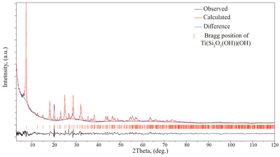 For the Rietveld refinement, PXRD patterns were collected on Rigaku SmartLab SE (Rigaku Corporation, Tokyo, Japan) 3 kW sealed X-ray tube, D/teX Ultra 250 silicon strip detector, vertical type θ-θ geometry, HyPix-400 (2D HPAD) detector. PXRD data were collected at room temperature in the 2θ range between 3° and 120° with a step interval of 0.02°. Rietveld refinement was performed on the powder diffraction patterns. The structure models of Ti(Si2O5(OH))(OH) were used as starting models, obtained from SCXRD (without H atoms), in the refinement utilizing RietveldToTensor software (v1.1) [1].