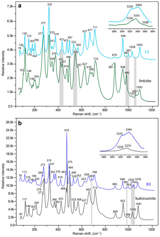 Raman spectra of pristine lintisite (green curve) and the L3 form (light blue curve) (a) kukisvumite (black curve) and the K3 (blue curve) form (b). The most significant differences in the positions or intensities of both spectra are indicated by gray lines.