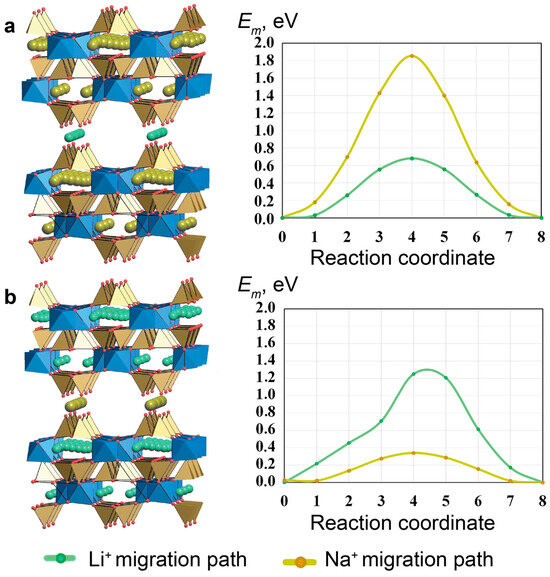 The migration energy barriers Em for AM-4:Li modification were also calculated using the DFT-NEB method [70,71], based on the generalized gradient approximation (GGA) with the Perdew–Burke–Ernzerhof (PBE) functional [72] and projector-augmented-wave (PAW) pseudopotentials [73], as implemented in the Vienna ab initio simulation package, VASP (v6.4.2) [74]. The cutoff energy was fixed at 600 eV in all calculations. For the geometry optimization, the convergence thresholds for the total energy and force components were chosen as 10−6 eV and 10−5 eV/Å, respectively. The shape and volume of the supercell were kept fixed at the optimized geometry. ToposPro software (v5.5.2.1) was used for the visualization of the Na+- and Li+-ion migration pathways. All NEB calculations were performed in the unit cell taken from the ICSD unit for AM-4 with the code 84261 (A2/a, a = 5.2012, b = 8.573, c = 29.3 Å, α = β = 90°, ɣ = 89.26°). This structure was used to construct a cell with the P1 symmetry of the composition Na6Si8Ti4O27. After cell optimization, part of the Na positions was replaced by Li, considering the fact that Na → Li was replaced during the AM-4 ion exchange in a LiCl solution. The two model cells have been constructed and optimized: Li2Na4Ti4Si8O27 (AM-4-I) and Li4Na2Ti4Si8O27 (AM-4-II). The NEB calculations for the Li+-ion diffusion (with fixed Na atoms) and Na+-ion diffusion (with fixed Li atoms) were carried separately for each model cell.