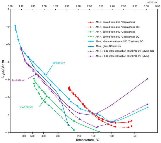 - The AM-4 sample (0.25 g) with graphite electrodes. For the impedance measuring two-contact cell, the sample was heated to 250 °C in a tubular furnace, kept at this temperature for 30 min, and resistance was recorded in the cooling mode. Then, the sample was kept at 500 °C for 30 min, after which its conductivity was recorded in the cooling mode.
