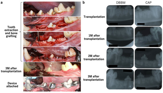 Intraoral photographs and dental radiographs obtained during tooth extraction and bone filler grafting. (a) Intraoral photograph. Tooth extraction and carrier implantation were performed. The state of healing 3 months after transplantation and a photograph of the attached device are shown. (b) Dental radiographs at the time of transplantation and 1-, 2-, and 3 months post-transplantation. DBBM was implanted on the right side, and CAP was implanted on the left side. Two months after the transplantation, trabecular formation was observed. (c) Intraoral and dental X-ray photographs every 2 months after the movement started.