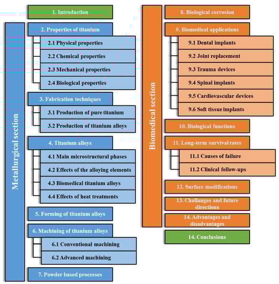 The present comprehensive review tries to navigate the intricate landscape of titanium alloys’ biomedical applications—a journey that traverses numerous medical disciplines, from orthopedics [] to dentistry [] and even cardiovascular care []. With an emphasis on elucidating the core attributes that underpin their exceptional versatility, we delve into the mechanisms that are responsible for the success of titanium alloys, but also the limitations.
