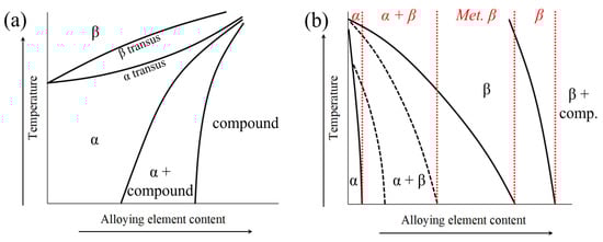 Alloying elements play a pivotal role in tailoring the properties of titanium alloys. Traditionally, titanium-alloying elements are divided into two groups, depending on the phase they tend to stabilize. Alloying with elements like aluminum, tin, and zirconium stabilizes the α-phase, enhancing strength and hardness, and increasing the beta transition temperature []. Elements like molybdenum, tungsten, chromium, iron, silicon, and copper stabilize the β-phase, improving ductility and high-temperature performances, and also decreasing the beta transus temperature []. Vanadium and niobium can act as an α- or β-stabilizer, depending on the composition of the alloy []. Additionally, light elements such as oxygen and nitrogen also have an α-stabilizing effect and a neutral effect on beta transus temperature. The role of alpha and beta stabilizers in the control of the microstructure of titanium alloys is summarized in Figure 2.