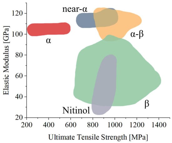 There is another titanium-based structure that is technically considered to be a nickel–titanium intermetallic. For the sake of this review, Nitinol will be considered a titanium alloy, despite containing about 55% nickel. This choice is mainly due to the large number of important biomedical applications and its availability on the market []. This material has been added to complete the panorama of Ti-based alloys used in biomedical applications. However, being an intermetallic and not technically an alloy, it will not be discussed in further detail in this review.